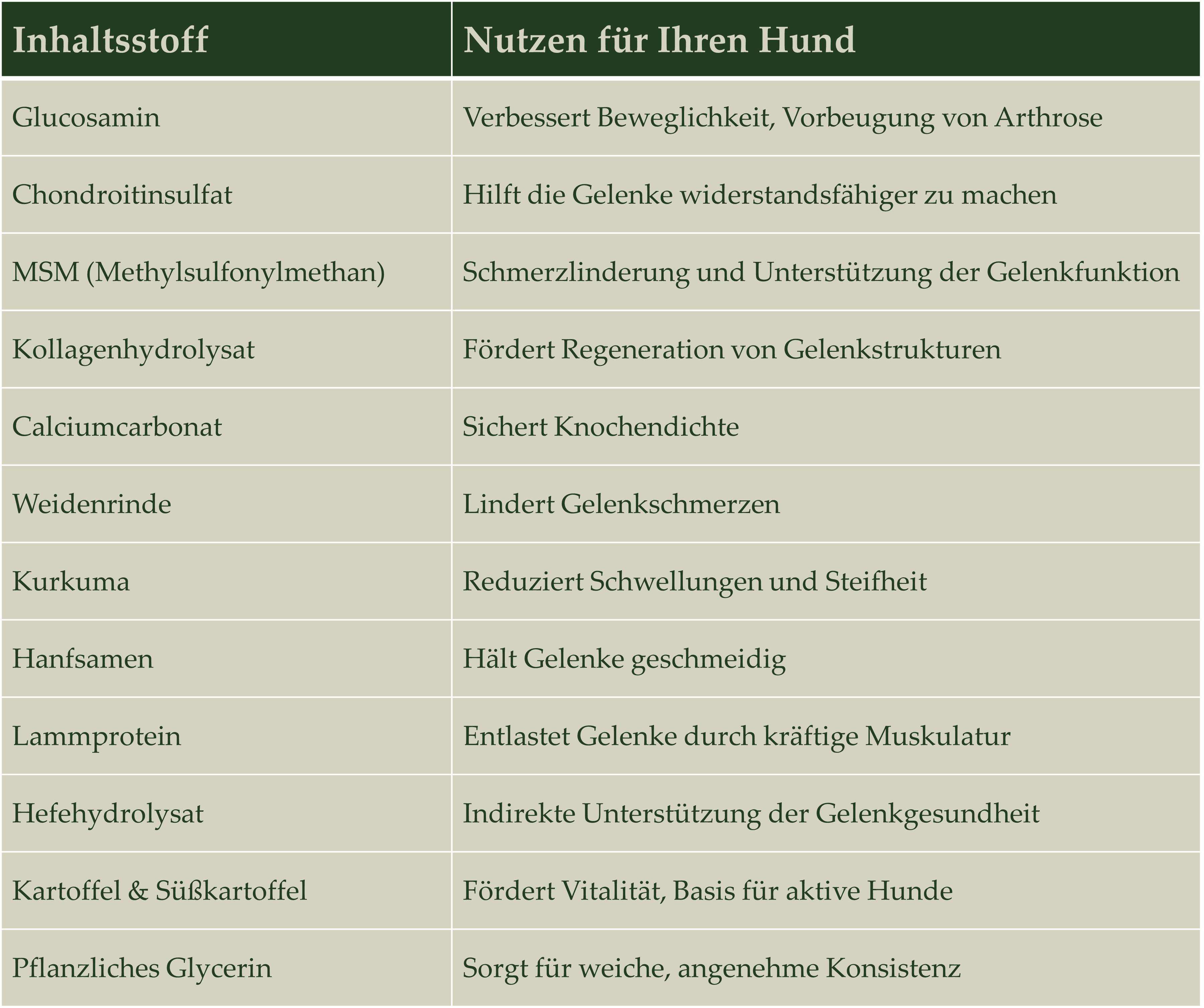 Eine ausgewogene Ernährung kann die Gelenkgesundheit und Knochenstabilität Ihres Hundes gezielt unterstützen. Unsere Inhaltsstoffe sind sorgfältig ausgewählt, um sowohl vorbeugend als auch bei bestehenden Gelenkbeschwerden positive Effekte zu entfalten: